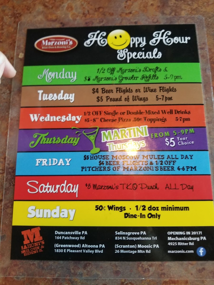 Everyday - Italian Wedding; Monday - Chicken Corn Rivel; Tuesday - Loaded Potato; Wednesday - Tomato Basil Bisque; Thursday - White Chicken Chili; Friday - Boston Clam Chowder; Saturday - French Onion; Sunday - Pasta Fagioli;